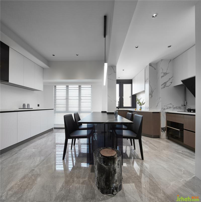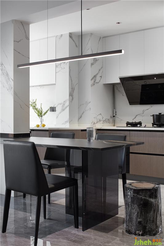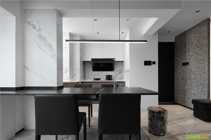 餐廳則舒暢至上,尊重材料本身質(zhì)感,以現(xiàn)代的設(shè)計(jì)手法推至空間每個(gè)角落,通透而不失大氣,開(kāi)放式格局,拉通空間與人的距離和關(guān)系。