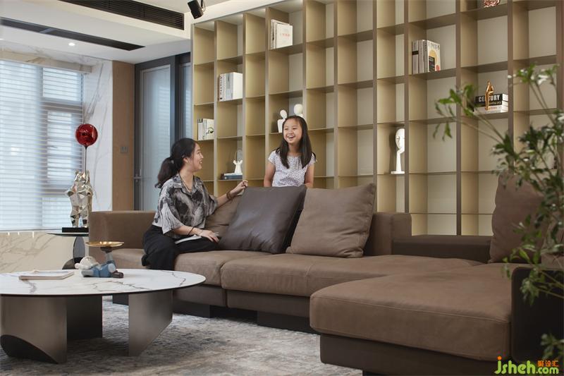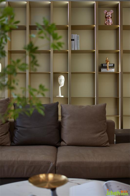 沙發(fā)后方定制整面不銹鋼開放格,且規(guī)劃回字雙動(dòng)線,巧妙串連室內(nèi)各個(gè)領(lǐng)域,電視墻結(jié)合豐富的收納,左側(cè)灰色柜體銜接展示格,木飾面成了空間的點(diǎn)睛之筆,帶來(lái)設(shè)計(jì)上的視覺(jué)新意,整體色調(diào)十分沉穩(wěn)大氣,通透的質(zhì)感,又增添了幾分開闊感。