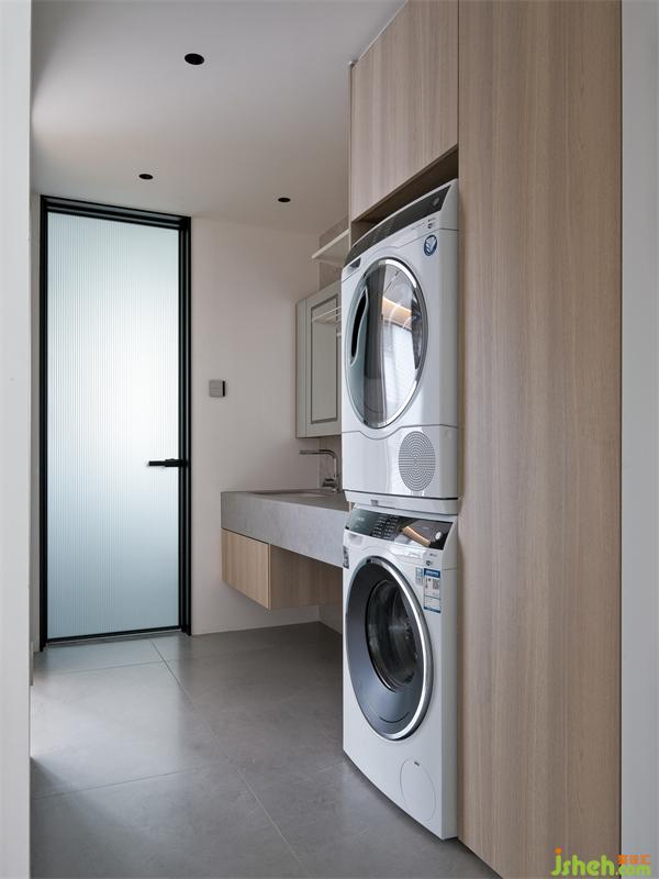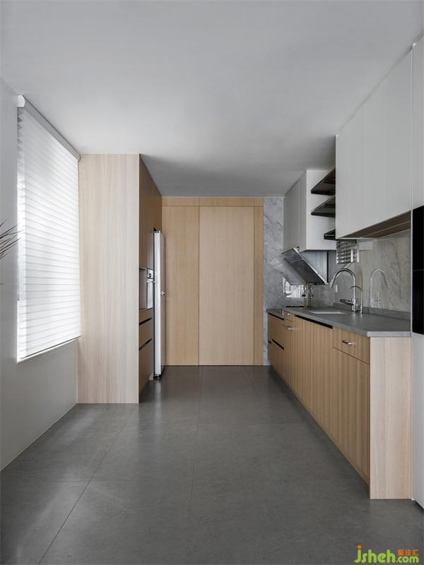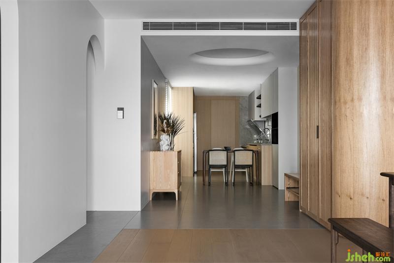 線條頂面,圓形燈膜,木色柜體相得益彰,形狀,材質(zhì),色彩,豐富空間層次,平衡視覺上的整體美感。