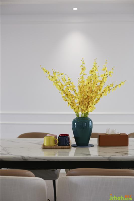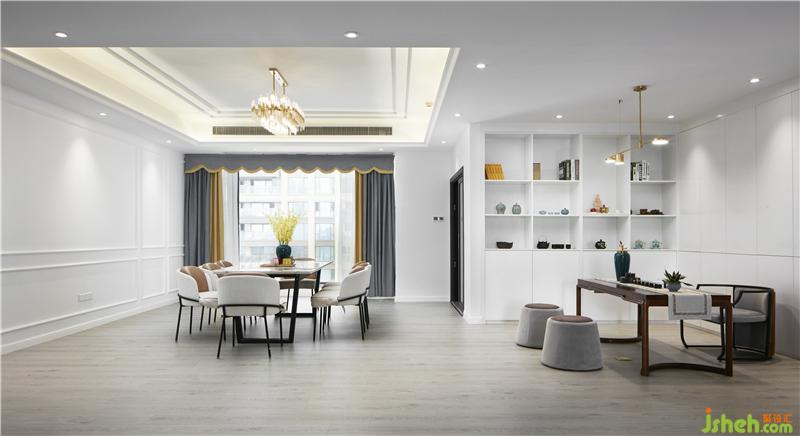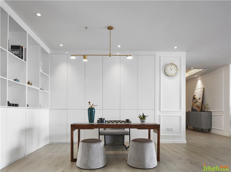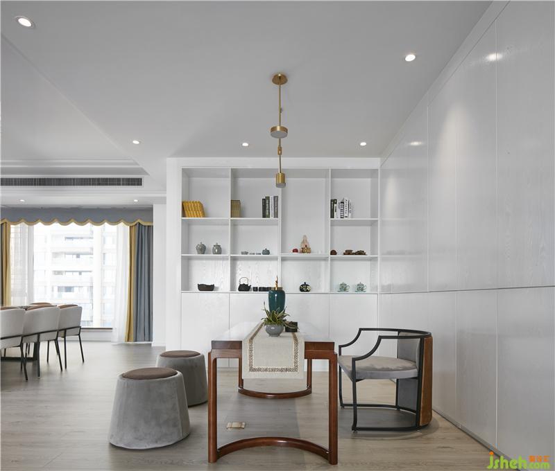 茶聊區(qū)運(yùn)用極簡的設(shè)計(jì)手法,開放式的布局,造型干凈利落的頂面與墻面,體現(xiàn)出現(xiàn)代簡約生活的品質(zhì)感。混合帶有新中式元素的家具,整個(gè)空間在白色的基調(diào)下,輔以精致的裝飾工藝品為點(diǎn)綴。室內(nèi)設(shè)計(jì)師