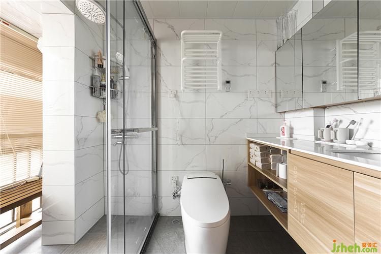 墻面整體用了白色的墻磚,洗手臺安裝了潔白的玉石,結(jié)合洗手臺的原木色柜門。地面采用了防滑質(zhì)感的布紋磚,淋浴房除了站立淋浴,也為老人設(shè)計(jì)了坐沐的木長椅,同時(shí)在面積受限的情況下把陰角位置巧妙地設(shè)計(jì)成桑拿式的沐浴功能,讓老人家更放松方便的享受淋浴。