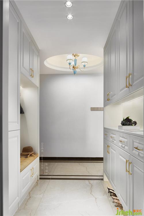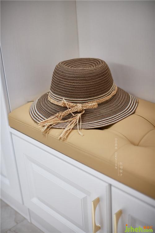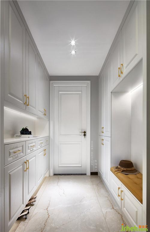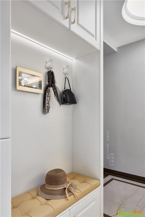 在進入入戶門的右手邊盡量是兩排大鞋柜,在兼顧實用性的同時。一排鞋柜中間做了鏤空的手法,下面做了高出20公分的鏤空,深圳室內(nèi)設(shè)計師也是為了平常拖的鞋子可以放進去,這樣就不會顯得亂糟糟的,拿出來也方便。對面的另一排鞋柜人性化地設(shè)計了可以坐著穿換鞋的位置,黃色的坐墊與純白的柜體形成了顏色上的碰撞。