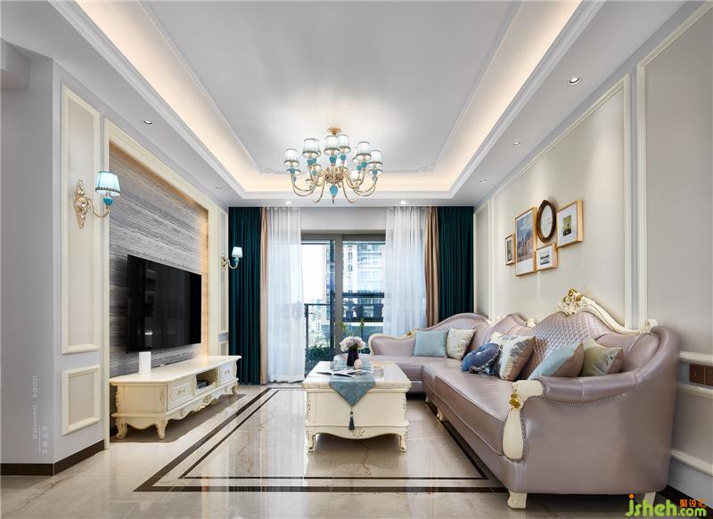 電視背景墻選用大理石紋理的墻布,彰顯了穩(wěn)重而不失優(yōu)雅的氣息,深圳室內(nèi)設(shè)計師整體硬裝的空間上采用了淺白灰、米黃色色為基調(diào),墨綠色的窗簾,弧度造型的沙發(fā)配上鑲金的雕花,金色邊框的抽象畫為點綴,繁衍出一種尊貴的美感。