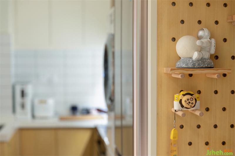 一進(jìn)大門就是一面緊挨著洗衣機(jī)柜體的木色洞洞板設(shè)計(jì),用于回家后放置小物件與裝飾品。