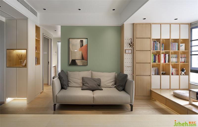 灰豆綠色的沙發(fā)背景墻在整個(gè)空間起著畫龍點(diǎn)睛的作用,掛畫靠在一邊讓墻體比例更加協(xié)調(diào)、舒適;木色的地板使空間更加溫馨。
