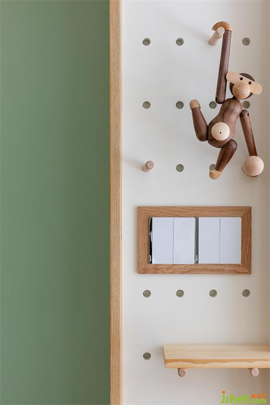 白色洞洞板是原先的剪力墻的位置,正面采用白色啞光烤漆洞洞板裝飾起來齊平右邊的書柜,左側(cè)面用木色條來收邊,增加造型的線條感。小猴子攀爬在小木棒的動(dòng)作增加了這個(gè)畫面的靈活性。