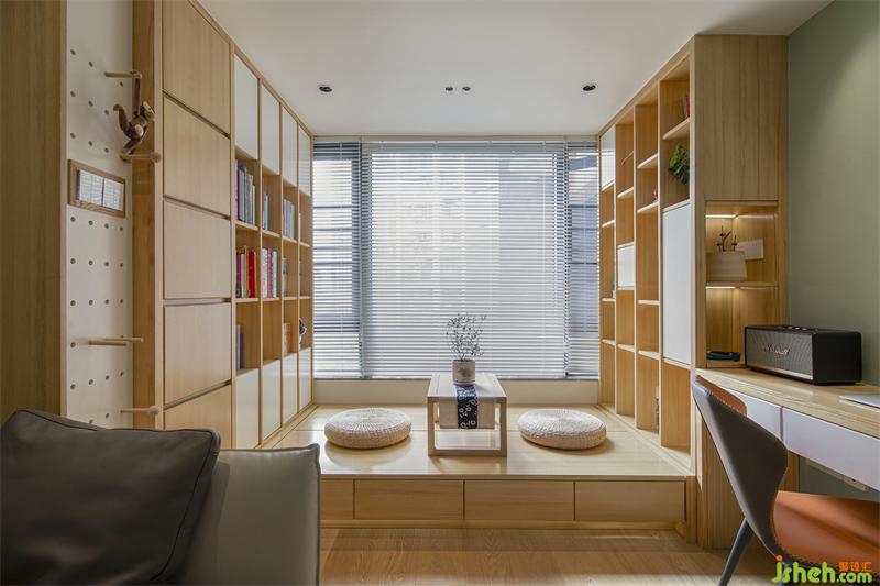 家居設(shè)計(jì)利用原來陽臺(tái)的區(qū)域,把窗戶封起來,這個(gè)就是休閑活動(dòng)區(qū),是大人閑聊飲茶的地方,既是親子互動(dòng)活動(dòng)的區(qū)域;整個(gè)空間采用了榻榻米,外面是四個(gè)抽屜的做法,用來收藏小孩子的玩具、小物件;里面則是掀開的做法,收納比較大體的物體等;榻榻米兩邊分別設(shè)計(jì)了不同的書柜造型,白色柜門的點(diǎn)綴使得它在木色中跳躍區(qū)分。