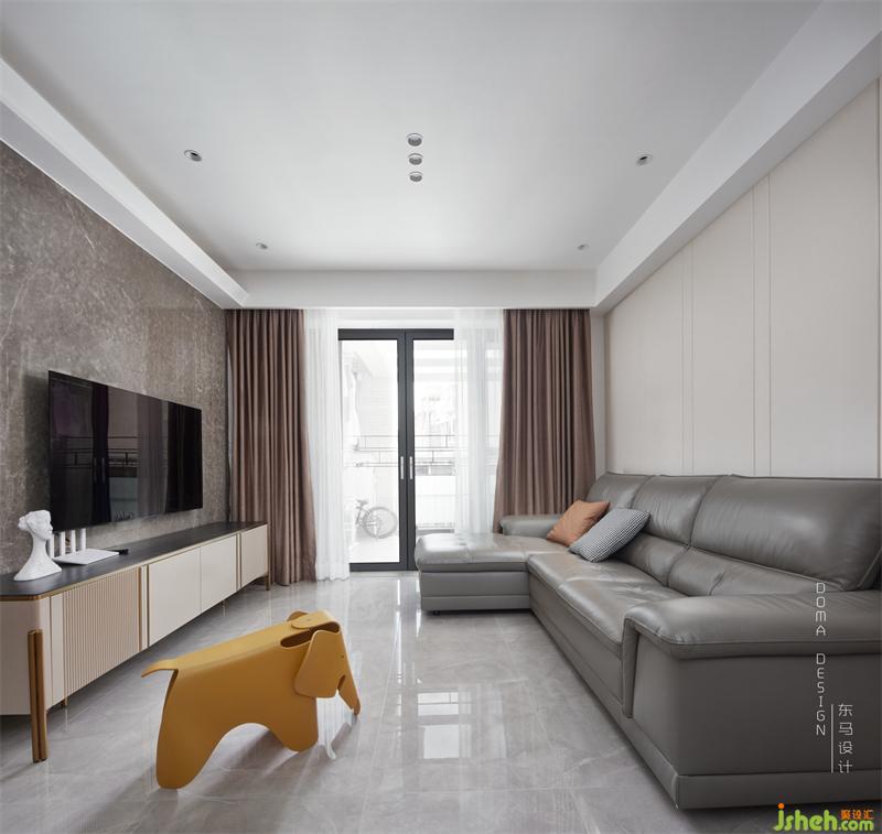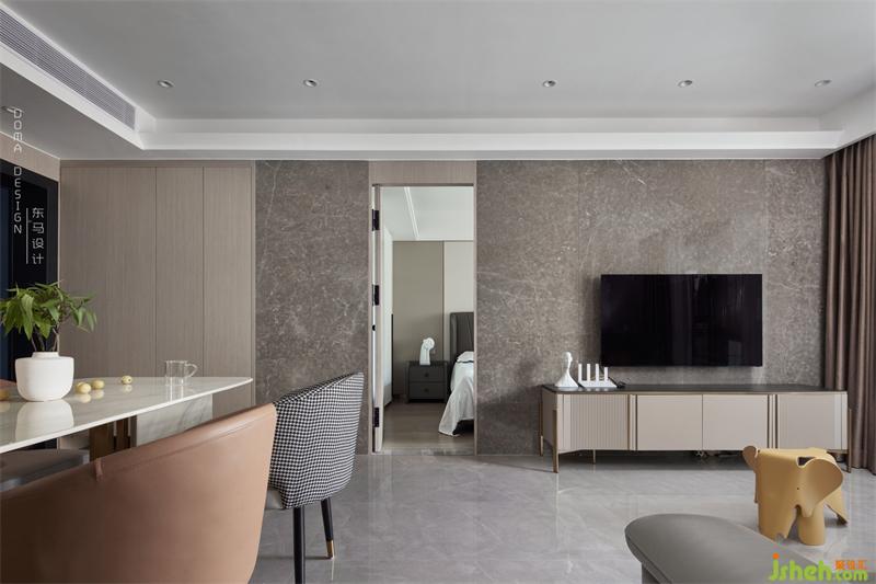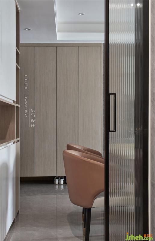 沙發(fā)背景是是暖色的硬包,采用大小塊的陣列排版,給墻面增加線條延伸感,干凈簡(jiǎn)潔的造型,線條設(shè)計(jì)和豎條的長(zhǎng)虹玻璃吊軌門結(jié)合,更是一種減法的表現(xiàn)方式?;疑牡孛嫱ㄤ伣Y(jié)合暖色的墻面,在小家具色彩的影響下也讓整個(gè)空間具有溫馨感。