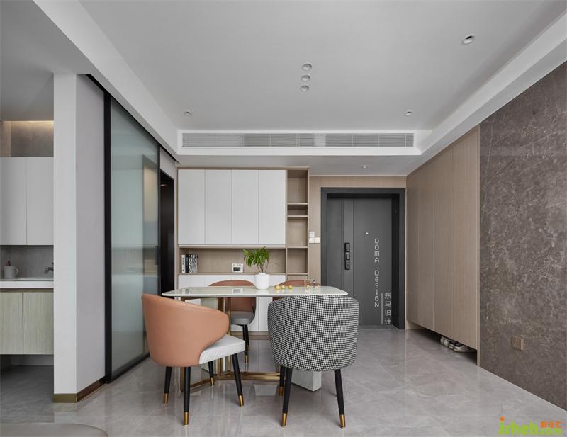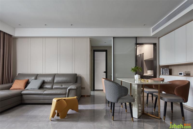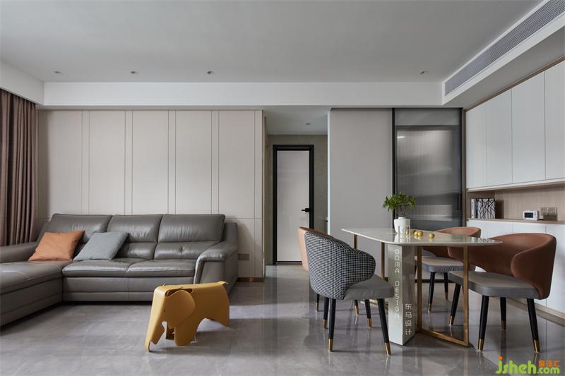 ②大門進(jìn)來(lái)是餐廳,右邊是餐邊柜和收納的結(jié)合,再進(jìn)來(lái)的是客廳的沙發(fā)區(qū)域,這兩個(gè)空間是一整體的長(zhǎng)方格局。