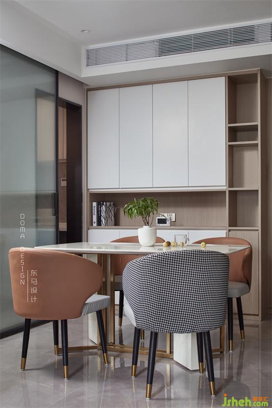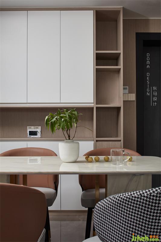 木色開放格和白色柜門的配搭,保持了整體的現(xiàn)代風(fēng)格,餐桌配搭石材一體和線條金屬的結(jié)構(gòu)。舒適的空間和家具的配搭,簡(jiǎn)潔流利