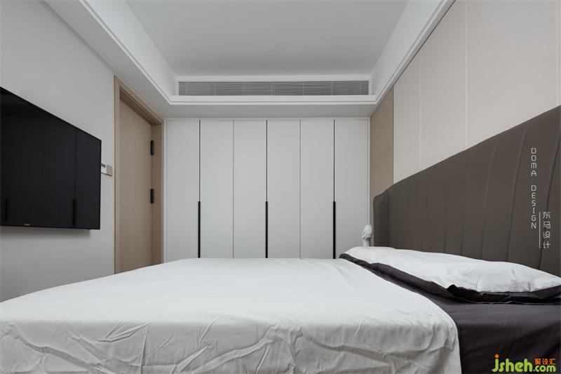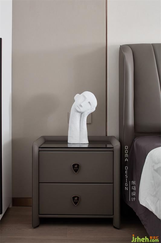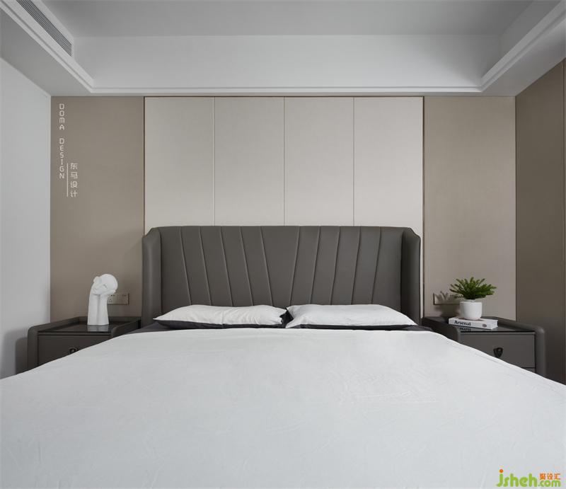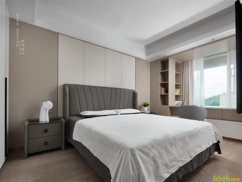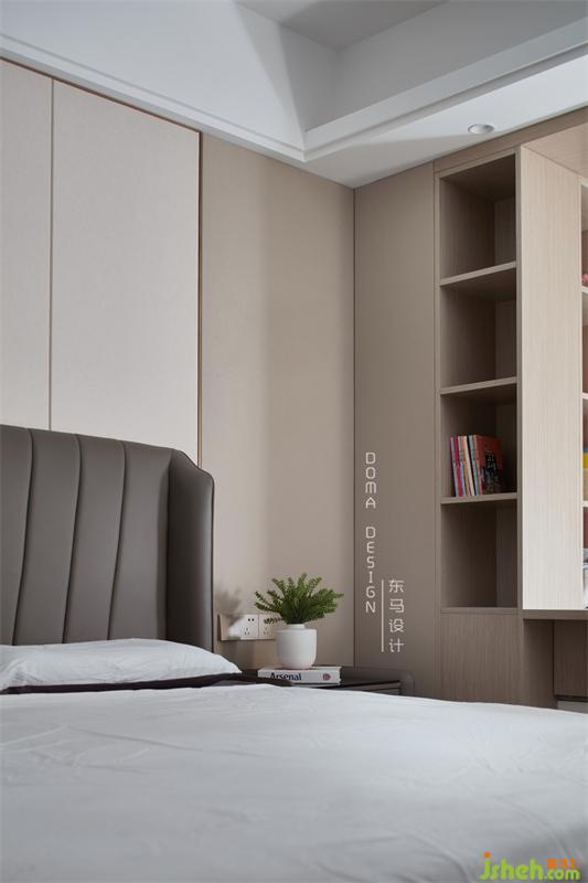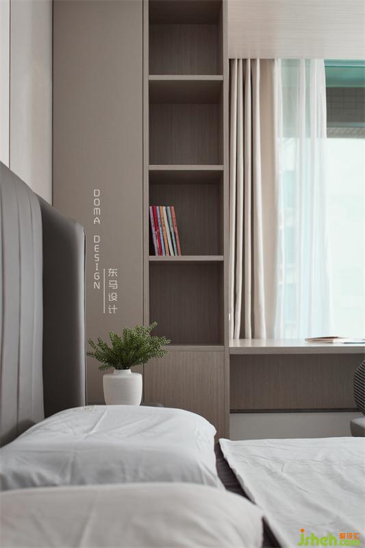 主臥的布置以素雅的暖色調(diào)為主,床頭對稱的深淺硬包、搭配灰色家具,讓身心得到充分的安歇與放松。窗臺設(shè)計(jì)了整排寫字桌。臺面和天花書柜為一體的設(shè)計(jì),和背景色也有一種延伸感。