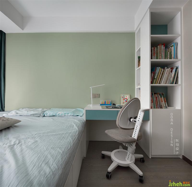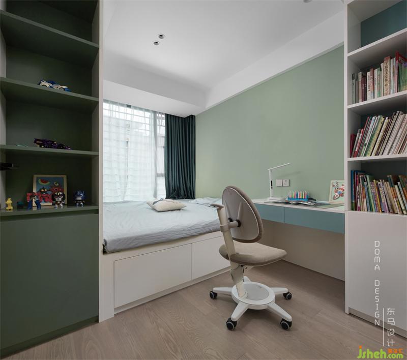 小孩房對門柜子側(cè)面是開放格的展示柜??煞胖脮?、小玩具,比傳統(tǒng)一塊板封閉的會更有立體層次,床頭是豆綠色墻面,榻榻米鏈接的是書桌,書柜我們結(jié)合實(shí)際空間舒適度我們是設(shè)計(jì)在桌子的一側(cè),小孩的高度也可以隨手拿放。