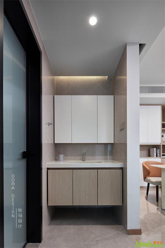 家居設(shè)計(jì)把洗手盆從衛(wèi)生間拿出來,在使用功能上減少?zèng)_突。木色的地柜和白色的吊柜配搭,鏡子考慮業(yè)主不喜歡對著門的情況下我們把它設(shè)計(jì)在吊柜里面,收納和鏡子的結(jié)合。