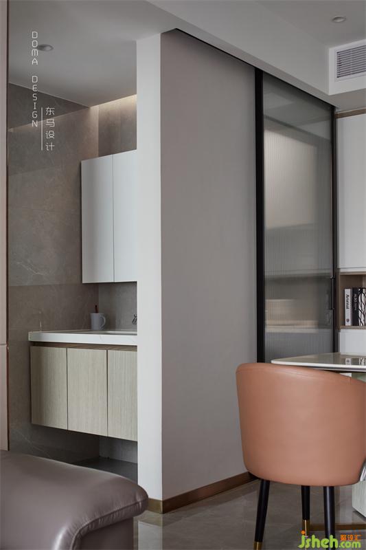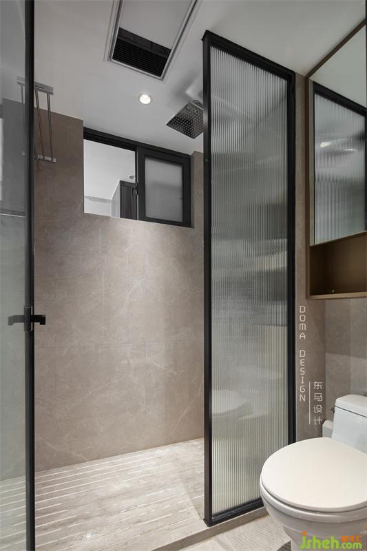 墻體一體的顏色,淋浴區(qū)地面是用了大理石拉槽的處理,隔斷我們做了半隔的方式,避免水噴射到馬桶我們剛好在馬桶長度的位置固定隔斷,花灑的背后是壁龕放置沐浴用品,馬桶背后做了一組玻璃柜門的吊頂,主要放置一些紙巾類和洗發(fā)水類,玻璃的元素也是為了空間的擴(kuò)大化。