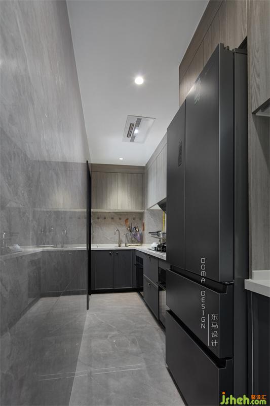 廚房整體灰色瓷磚,櫥柜也是選用兩個(gè)顏色的分色,深灰色的地柜配搭木色的吊柜,臺面是白色的巖板