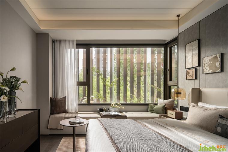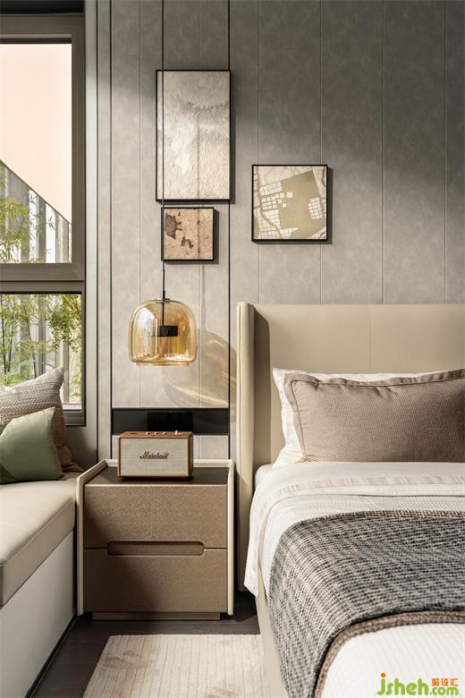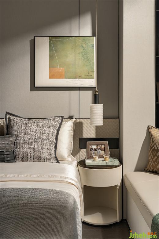 次臥低調(diào)含蓄的床頭吊燈奠定空間基調(diào),空間中材質(zhì)肌理豐富卻內(nèi)斂,利用不同明度和色彩傾向的灰色賦予空間輕奢優(yōu)雅的品質(zhì)感。