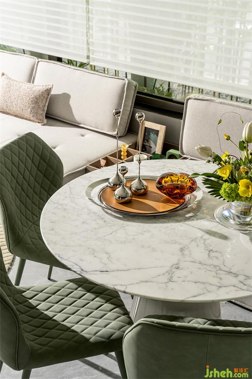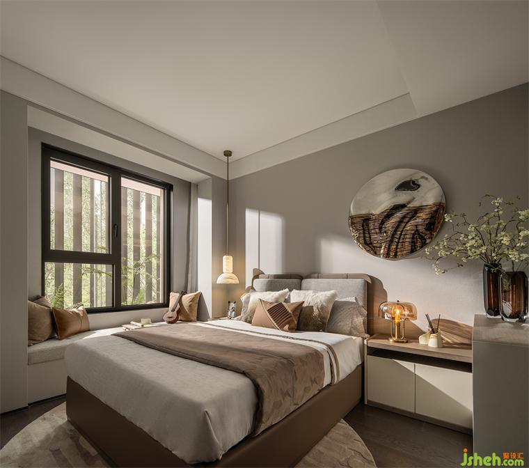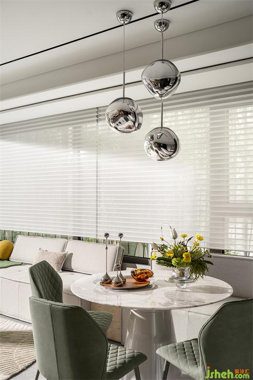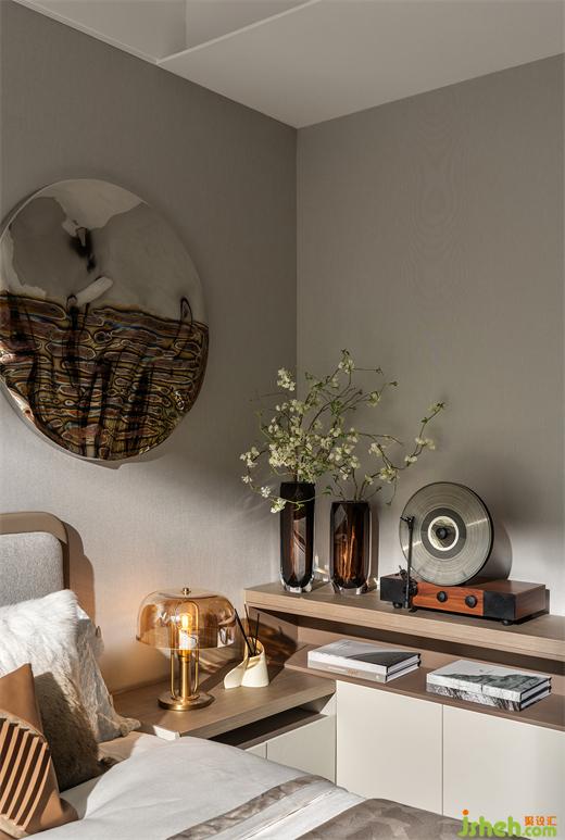 次臥的圓形元素和金屬色的點(diǎn)綴應(yīng)用在房間里,匯合成有趣的光影實(shí)驗(yàn),這些元素讓家有了活力。樣板間設(shè)計(jì)直線與曲線的和諧應(yīng)用,萃取其形而上,與直覺意趣共鳴。