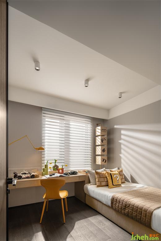 男孩房設(shè)計(jì)以黃色作為主色調(diào),充滿了活力和歡快。墻面上裝飾魔方儲(chǔ)物空間,為房間增添了趣味和創(chuàng)意??臻g布局簡(jiǎn)潔明快,以實(shí)用為主導(dǎo)。床鋪、書桌和衣柜等家具均采用簡(jiǎn)約的線條設(shè)計(jì),符合現(xiàn)代審美表達(dá)。