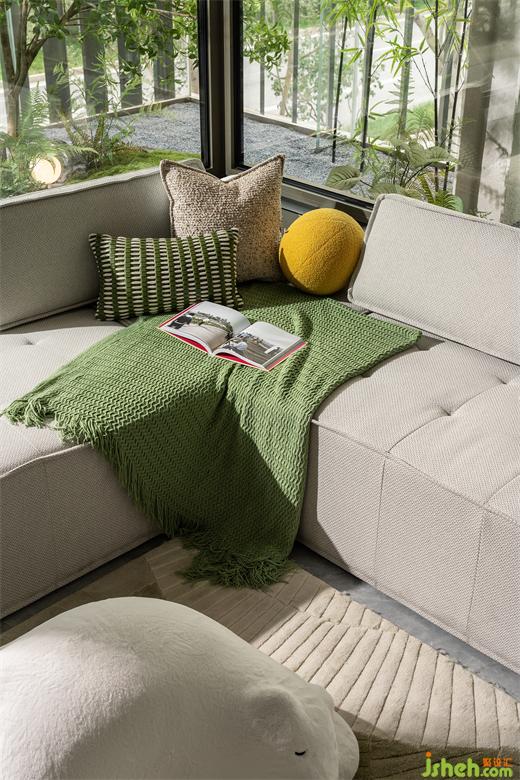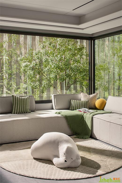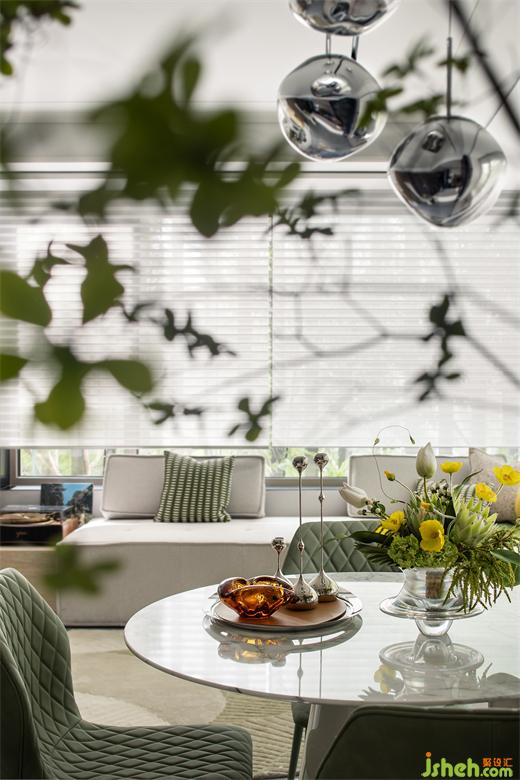 L型沙發(fā)設計最大化地利用了采光,提供了大面積的社交娛樂空間。MINI吧臺結合客餐廳一體的設計,有效拓展了公共區(qū)域的活動范圍與分區(qū)層次,最大化挖掘相鄰場域的互動。
