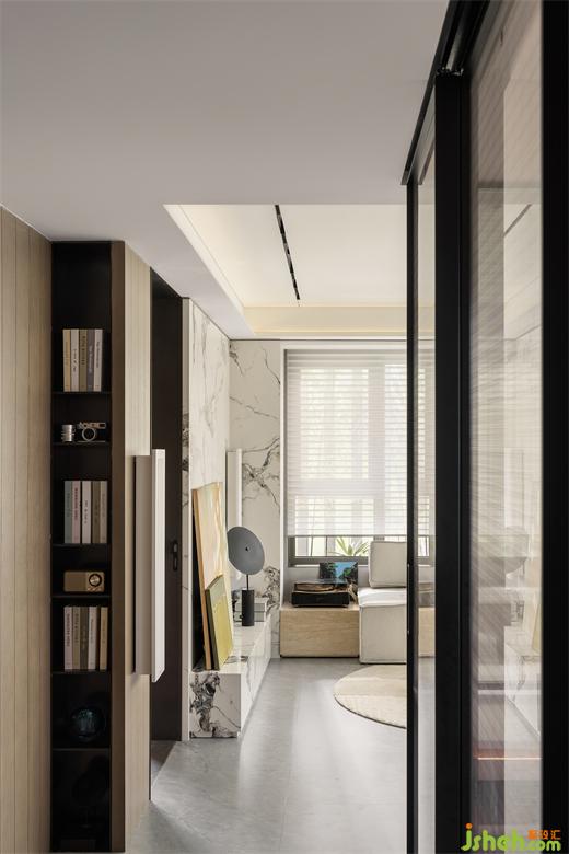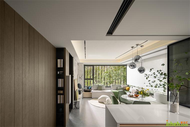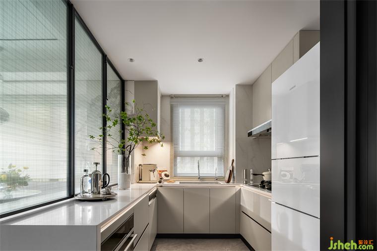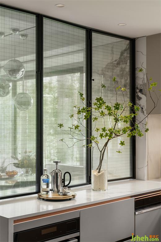 空間的尺度遵循完美的設計比例,推拉式的窗戶設計延伸了空間功能,完全打開之后形成交互式的廚房設計,和諧且美觀,樣板間設計于細節(jié)處彰顯設計師對功能梳理的匠心思考。