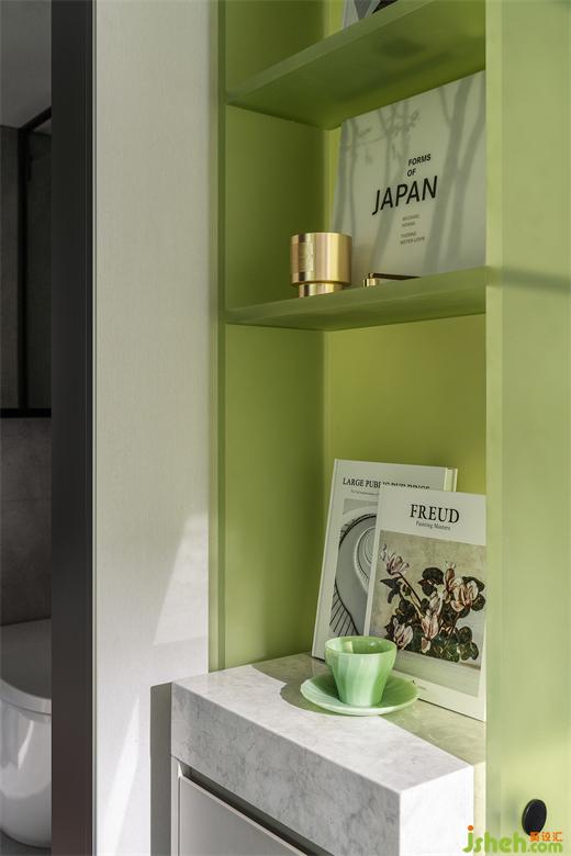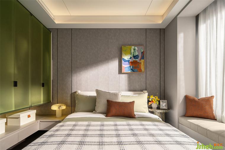 綠色亞克力衣柜色調清新自然,與主臥的年輕氛圍完美融合,為主臥設計注入時尚氣息??臻g橙色跳色恰到好處,為空間增添了一抹活力與靈動,藝術掛畫呈現(xiàn)出年輕人的生活態(tài)度與個性張揚。