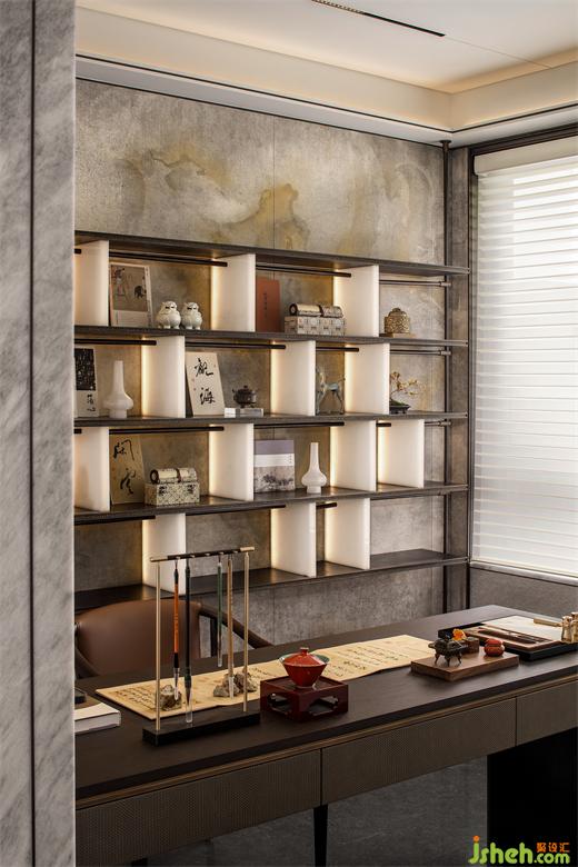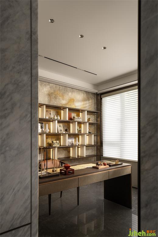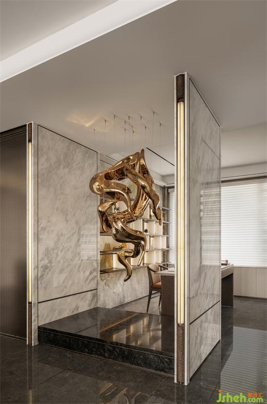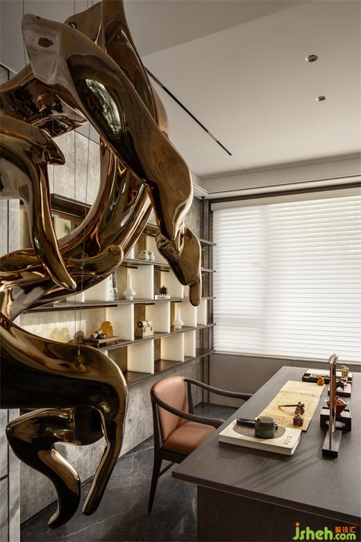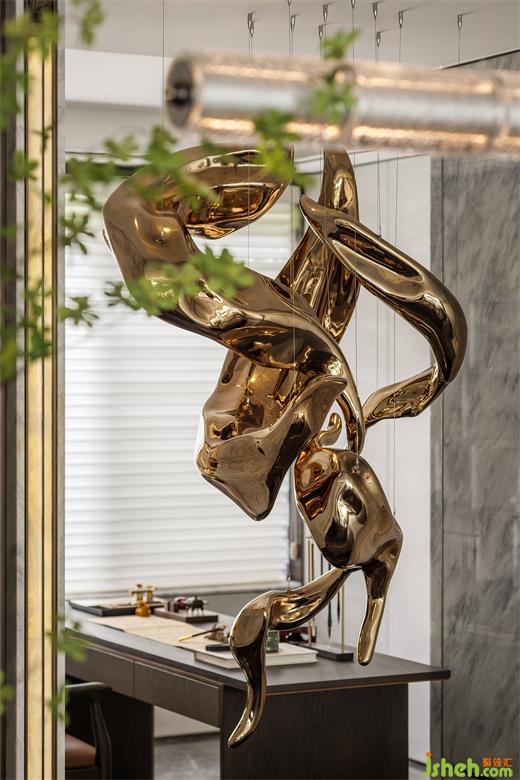 大鵬一日同風(fēng)起,扶搖直上九萬里。自由生長的金屬藝術(shù)裝置,為空間增加一絲寫意氛圍,與書房深色不銹鋼的金屬桿元素相映成輝。