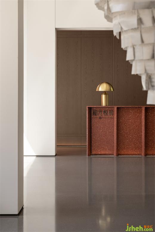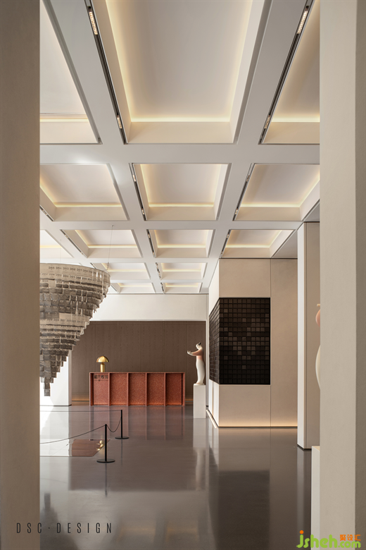 流暢的線條、干凈的色調(diào)與浮動(dòng)的日光縱橫交織,彼此成就空間的和諧韻律。售樓處設(shè)計(jì)由頂部至墻面的格子元素呈現(xiàn)出連貫的視覺語言,指向著現(xiàn)代主義的純粹序列,配以深褐墻板與灰調(diào)石板塑造出空間形態(tài)的當(dāng)代面貌,于理性的細(xì)節(jié)刻畫出空間的秩序。