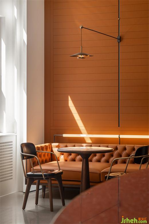 圍繞咖啡吧臺,展開向內(nèi)探索的洄游動線。作為空間的視覺核心處,咖啡吧臺衍生為一個賞味咖啡、洽談交流的多功能區(qū)域。以圓弧形的簡練構(gòu)造切入,捎帶復古感的紅色水磨石、原木高腳皮凳作為吧臺底色,細節(jié)之處搭配工業(yè)感的線性切割,過去而當下,中古又現(xiàn)代。