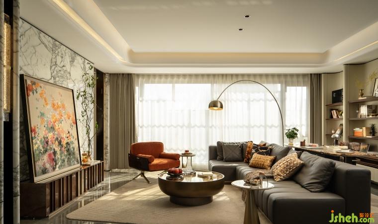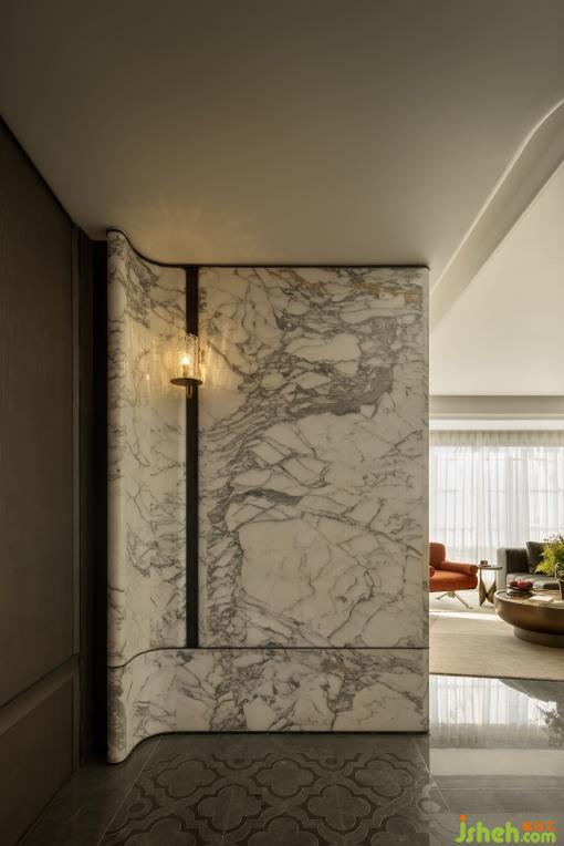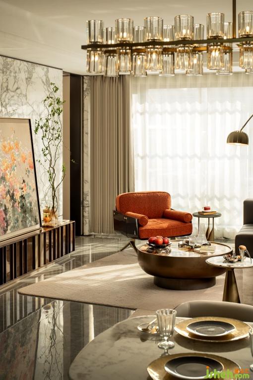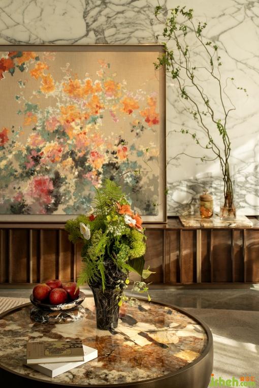 入戶玄關(guān)作為歸家的首幕劇場,以天然的石材肌理與溫潤的木飾面為畫布,光影流轉(zhuǎn)勾勒材質(zhì)細節(jié),讓每一次歸程都浸潤于雅致與溫情交織的儀式感中。6.4米橫廳打破傳統(tǒng)邊界,重構(gòu)社交場景。Minotti Goodman系列模塊化沙發(fā)搭配圓形大理石茶幾,形成圍合式洽談區(qū)。大理石墻面以天然紋理鋪陳基底,搭配大幅海棠花藝術(shù)掛畫,歸家即是一場跨越物質(zhì)與精神的雙重抵達。