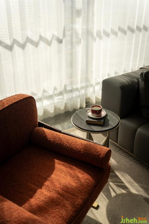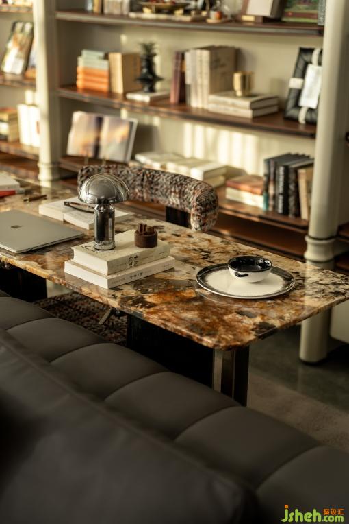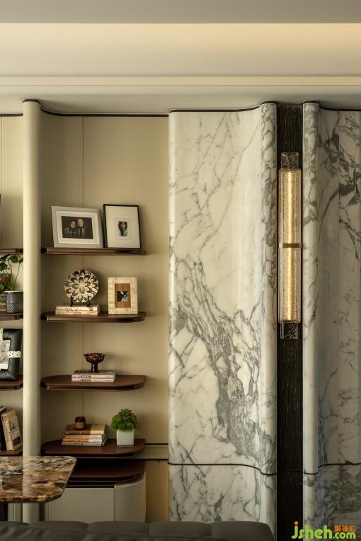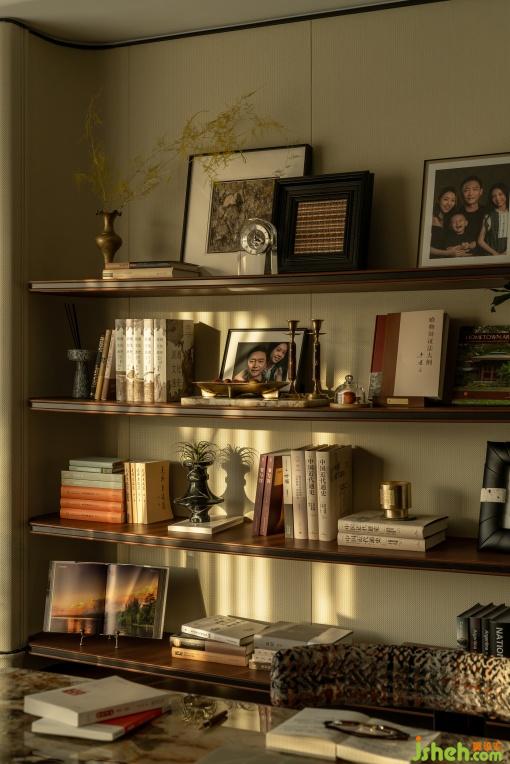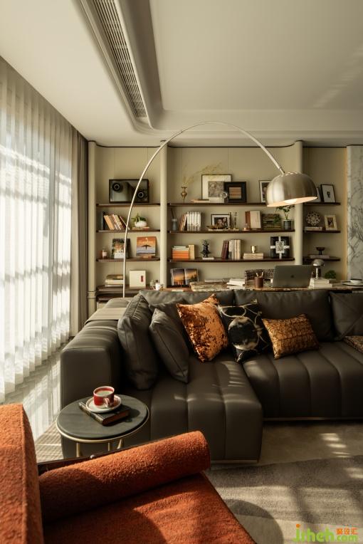 開放式書房與客廳形成洄游動線,滿足社交與家庭活動的雙重需求。墻面與層板皮革材質(zhì)流露出人文生活的品質(zhì)感,通高的展示架為未來生活預(yù)留審美生長空間,這里不僅是書籍與藝術(shù)品的陳列場,更是家庭文化的展示臺。