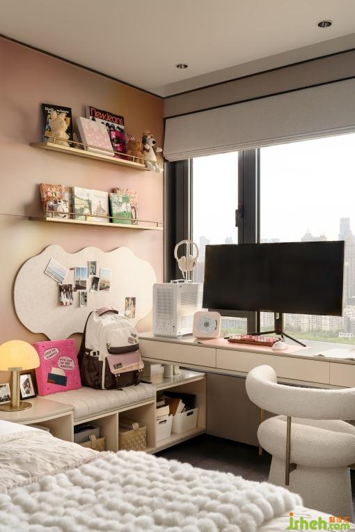 男孩房以汽車文化構(gòu)建機(jī)械未來(lái)感空間,為休憩場(chǎng)景注入趣味。女孩房以“星光造夢(mèng)”為主題,將閱讀愛(ài)好與審美培養(yǎng)融入日常場(chǎng)景,打造出一個(gè)承載生活趣味與成長(zhǎng)記憶的少女專屬空間。