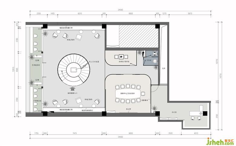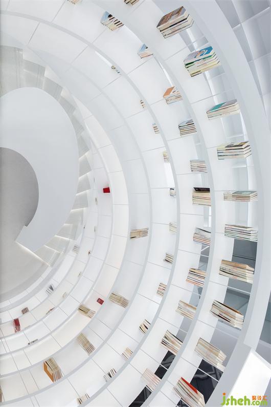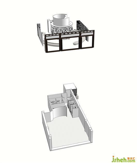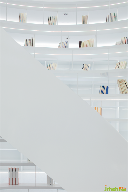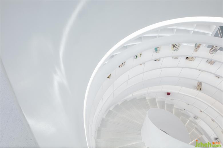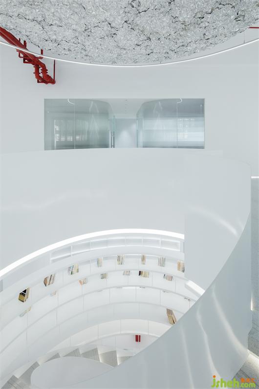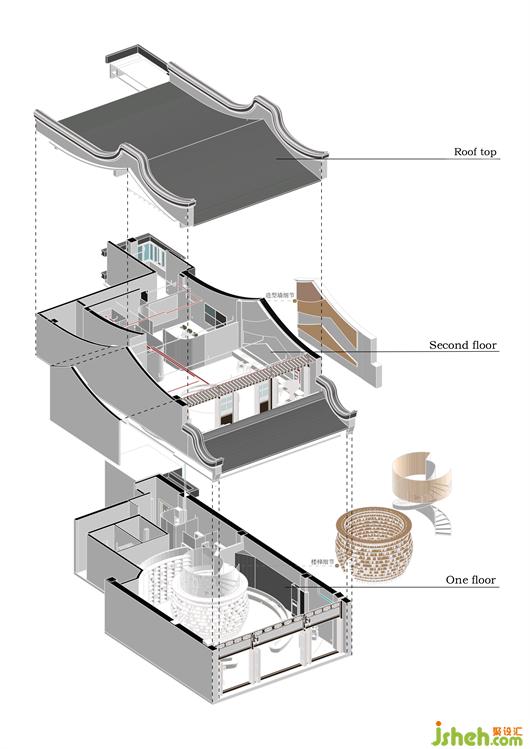 由于建筑單層平面面積不大,功能間及辦公處都盡量考與平面的后端,留給受眾最大的公共空間。在達(dá)到設(shè)計效果的同時滿足了A級景區(qū)游客中心的所有功能需求。球形樓梯的功能衍射到歷史文創(chuàng)品的展陳需求及貫穿二樓,將空間由二維平面轉(zhuǎn)換為三維立面,結(jié)合球形層架不同文化書籍、大漆器皿、藝術(shù)品等物件,猶如一個大型魔幻球,供訪客自由探索藝術(shù)與知識的魔力。