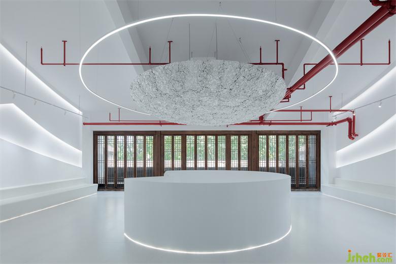 有限的平面空間切出一個圓形內(nèi)核,把人群聚集在空間的中位,破除建筑場域的既定界線,游客中心設(shè)計在開放式的平面格局里回歸到建筑空間本身的社會本質(zhì)使用性,并最大程度把戶外的自然光影引入室內(nèi)。二樓露臺午后的陽光透過古式花格門映在山脊線的白墻上,如把歷史的記憶刻畫定格在此時,從前與當(dāng)下變得模糊,徹底融合與空間的感受。