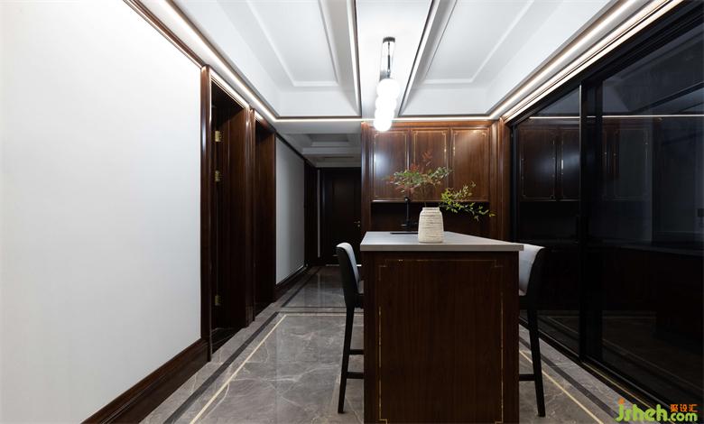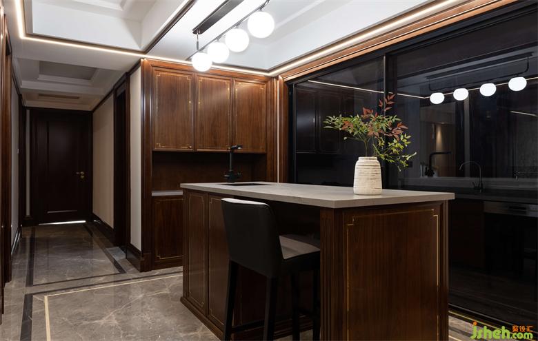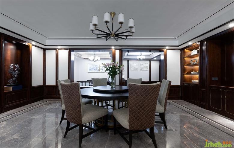 餐廳高端的美克A.R.T.實(shí)木圓形餐桌,家居設(shè)計通過與地面的平花大規(guī)格地磚,深淺色調(diào)的配色,表達(dá)出不同材質(zhì)融合的魅力,使得每個家具獨(dú)立而不孤立。頂墻酒水柜使用高端胡桃木的實(shí)木柜,兼具裝飾、收納的職能,內(nèi)嵌的裝飾畫及裝飾品,彰顯主人輕奢的生活品味和格調(diào)。