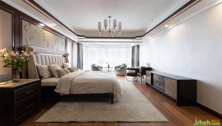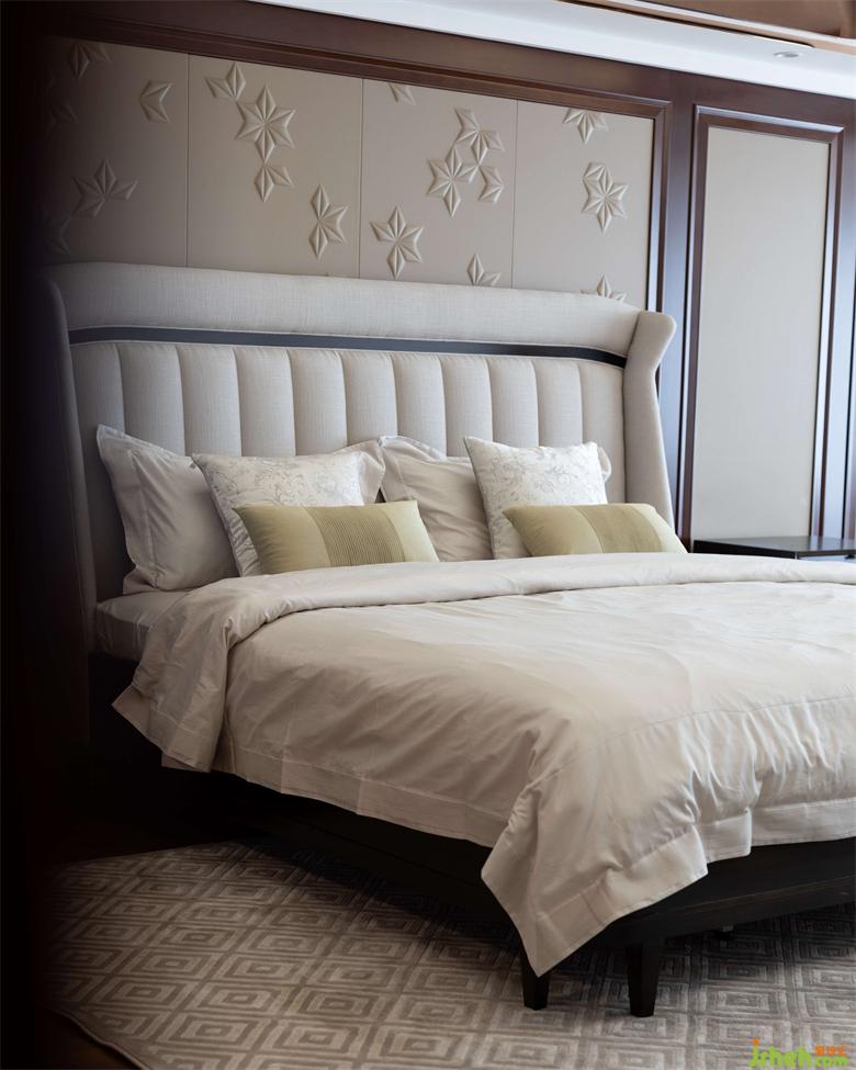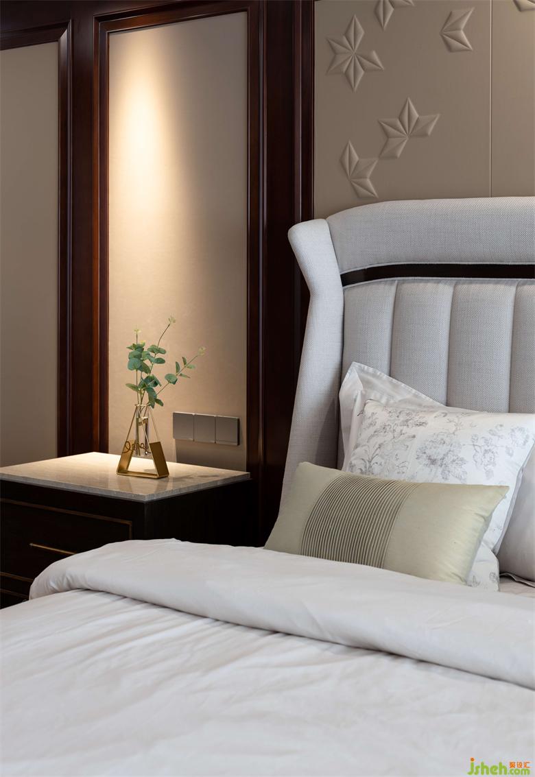主臥整體色系給人一個溫馨的空間,墻面大面積采取藝術(shù)漆、背景墻主體設(shè)計胡桃木護(hù)墻板,家居設(shè)計配合著現(xiàn)代感的淺色硬包,為整體空間奠定了簡約時尚的格調(diào)。奢適的性能、精細(xì)的工藝,營造出大氣舒適氛圍的主人房。