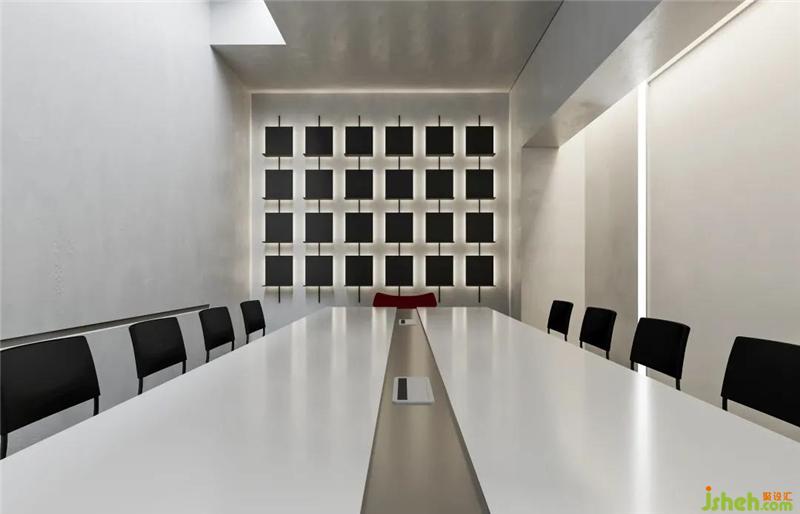 會(huì)議室是一個(gè)人們溝通交流的地方,也是一個(gè)情感互相傳遞的空間,成為藝術(shù)、情感、記憶、研究、設(shè)計(jì)自然而然交匯的成果。為了滿足會(huì)議室的常規(guī)功能需求,設(shè)計(jì)師還在環(huán)境氛圍上作出了創(chuàng)新,運(yùn)用建筑和燈光相結(jié)合,為空間場景做出不同氛圍效果。