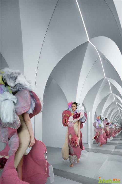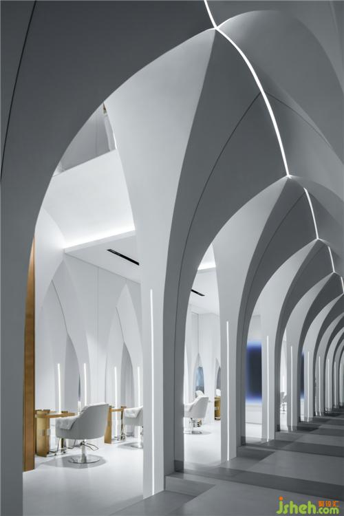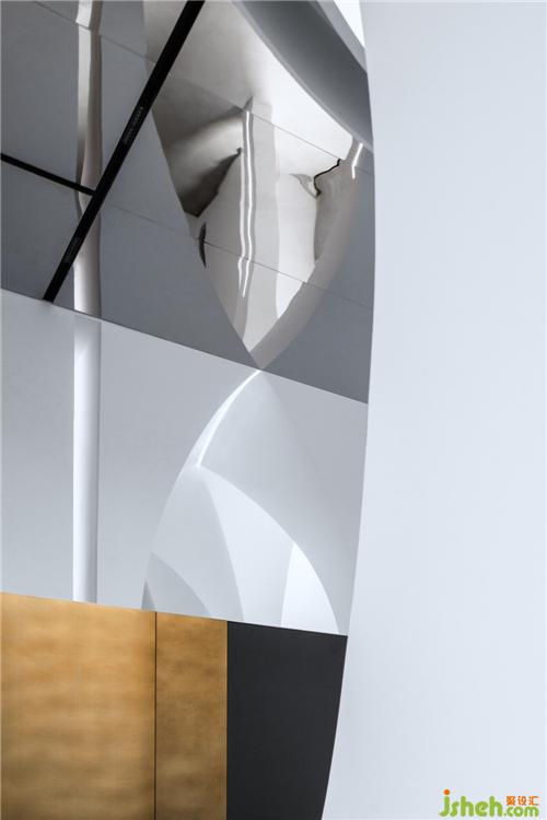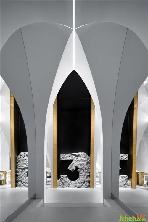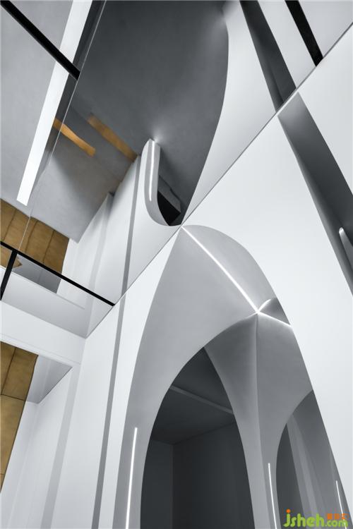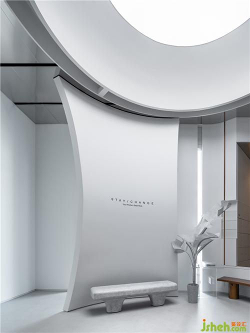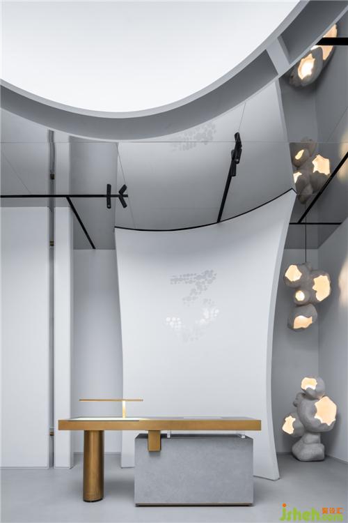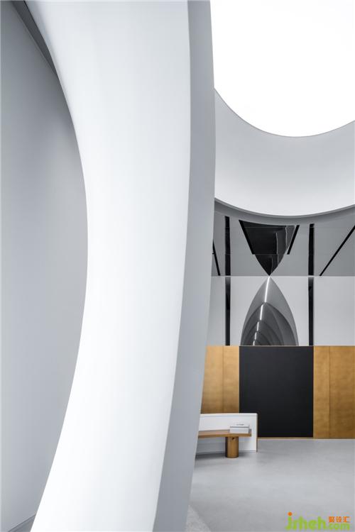 安東尼奧·高迪說(shuō)過(guò),“直線屬于人類,而曲線歸于上帝。”弱化過(guò)多的直線和平面,以圓形、鏡像、雙曲線、拋物線各種變化組合成充滿韻律動(dòng)感的異形空間。展廳裝修設(shè)計(jì)純白的光線灑落在空間中心,天空被打開(kāi)了一道通往另一個(gè)時(shí)空的洞口。