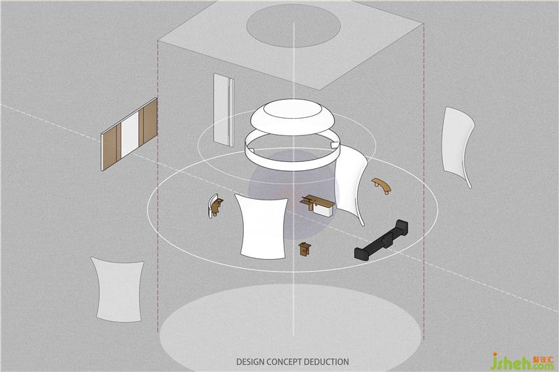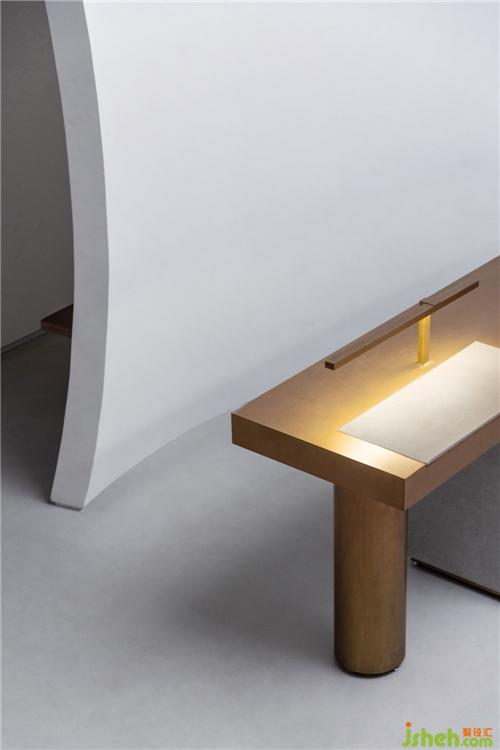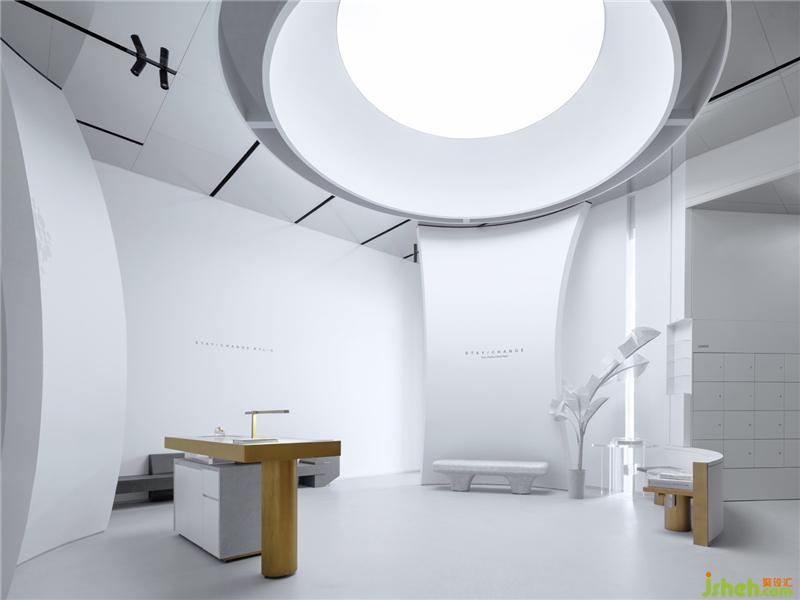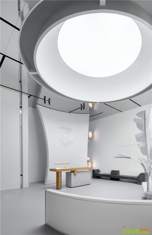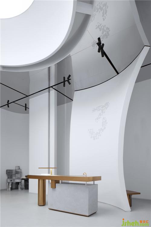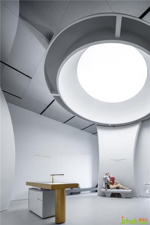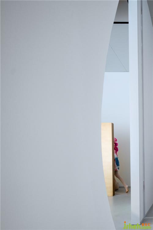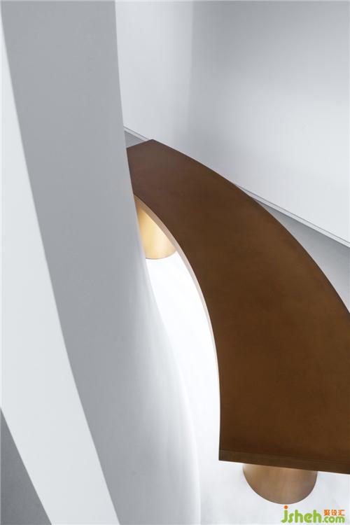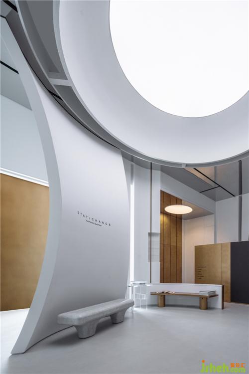 空間之間存在著感官上的節(jié)奏感,緊湊的,松弛的,流暢的,我們的空間感官被周圍影響著。入口用柔和的弧線展示歡迎的姿態(tài),等待觀眾投入它的懷抱。當(dāng)我們從入口緩緩進入這個神秘的空間,謹(jǐn)慎的空間感官才被突然張弛開來,一緊一放之間帶給人驚喜之感。