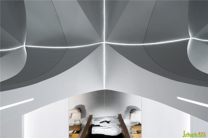 三曲面幾何形式與數(shù)學(xué)原理的理性反應(yīng),形成一個貫穿整個長廊的富有韻律的結(jié)構(gòu)。純粹的穹頂,呈現(xiàn)多面的輪廓,以緊湊的形式聚合為整體。展廳裝修設(shè)計(jì)現(xiàn)代與傳統(tǒng)正試圖在過去與未來之間建立對話。純白的體塊被一一拼接,暗示著一種對未知時空和永恒的追溯。
