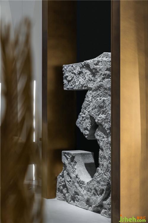 △ 設(shè)計(jì)師運(yùn)用長廊表達(dá)項(xiàng)目品牌的精神堡壘,如碑文般肌理的logo字還在處于非雕塑成品的狀態(tài),暗喻著品牌需要持續(xù)打磨和發(fā)展,未精雕鑄的狀態(tài)是寶貴的,意味著很多可能性