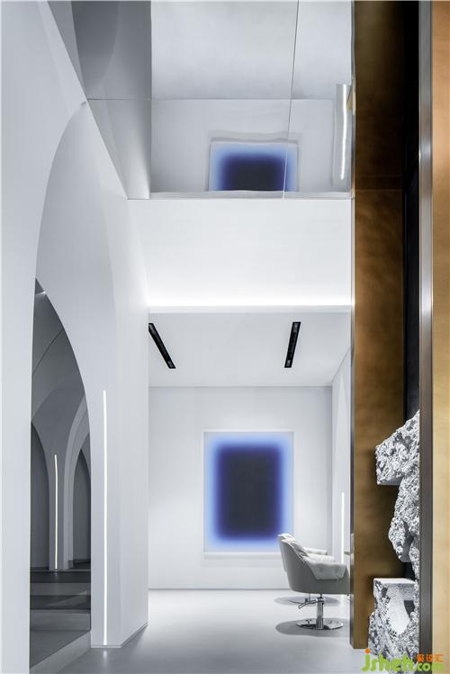 鏡面應(yīng)用是空間的鏈接,藝術(shù)畫和無限回廊互相呼應(yīng),空間的盡頭變得越來越模糊,最終成為一個黑點(diǎn)。人們走在通往未知空間的路上在探尋點(diǎn)什么,卻又沒有找到問題的答案。