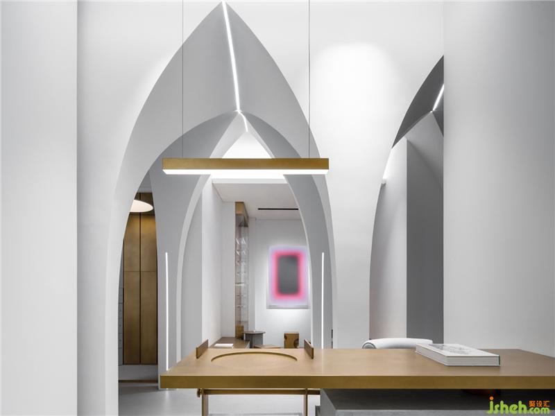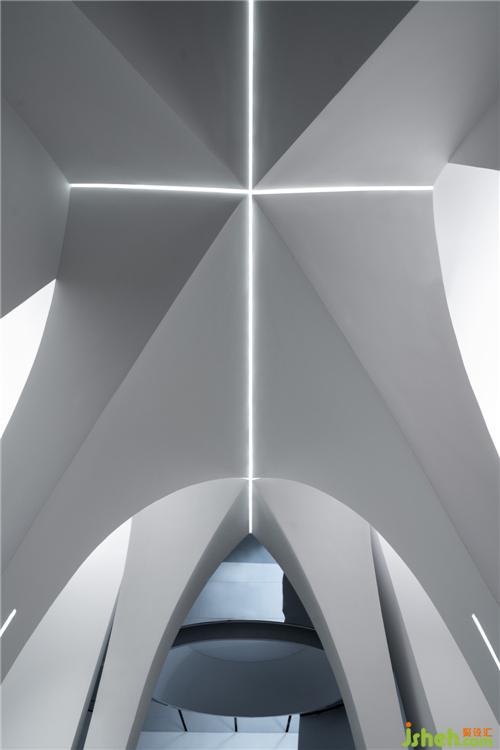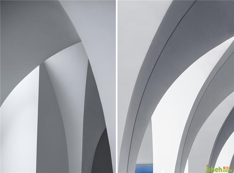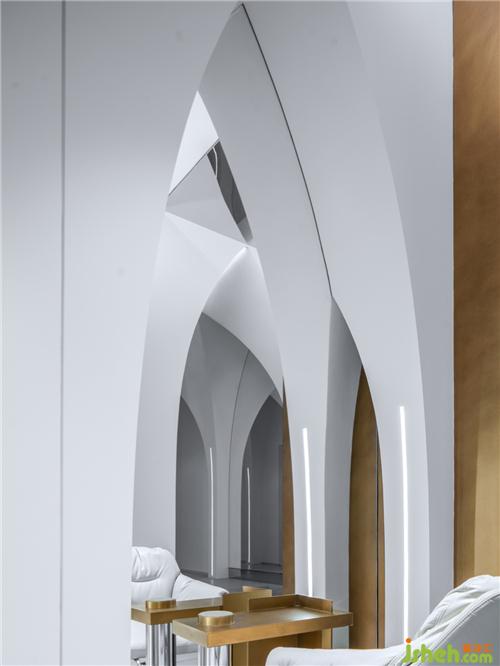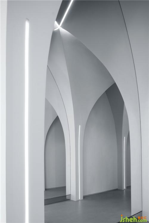 墻面經(jīng)過精細(xì)打磨粉刷,曲線形成的弧度延伸向下,微妙地把空間劃分成舒適的休息之處,屬于放松休息的空間于神圣莊嚴(yán)的長廊形成微妙的呼應(yīng)。展廳裝修設(shè)計(jì)來往時(shí)空長廊的人們不知道在接下來的路上將如何發(fā)展,但依然堅(jiān)信在未來實(shí)現(xiàn)一切可能。