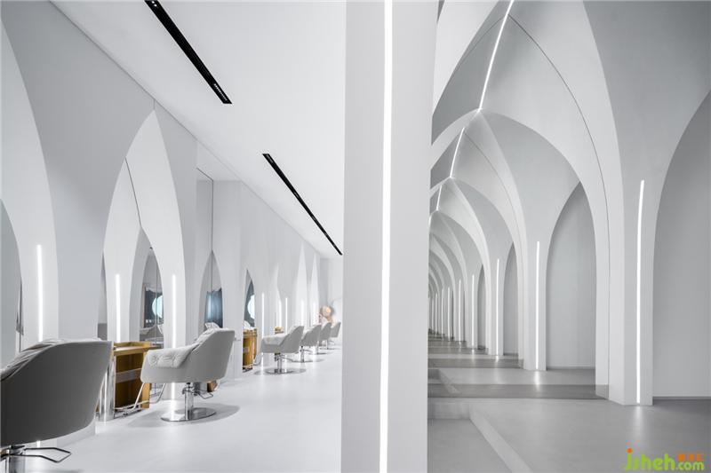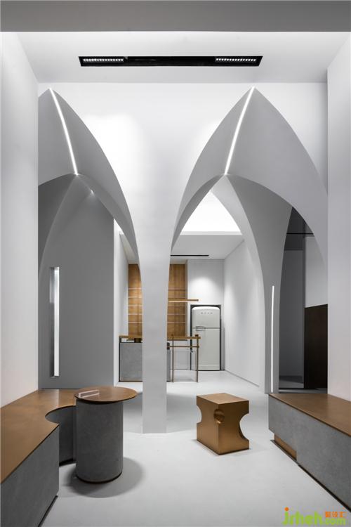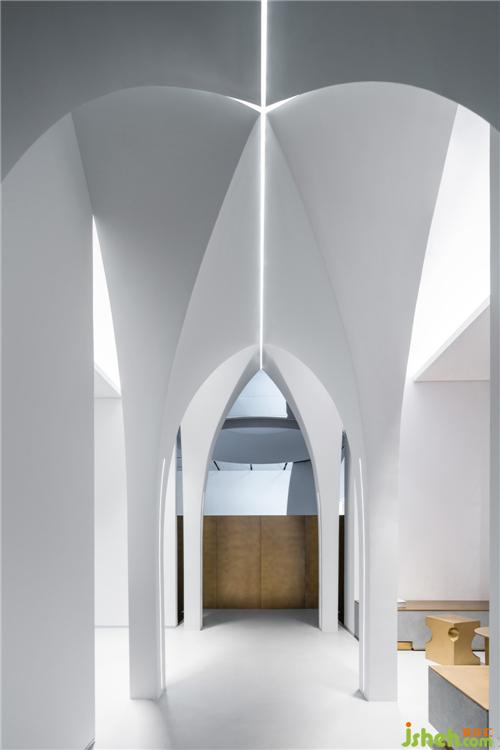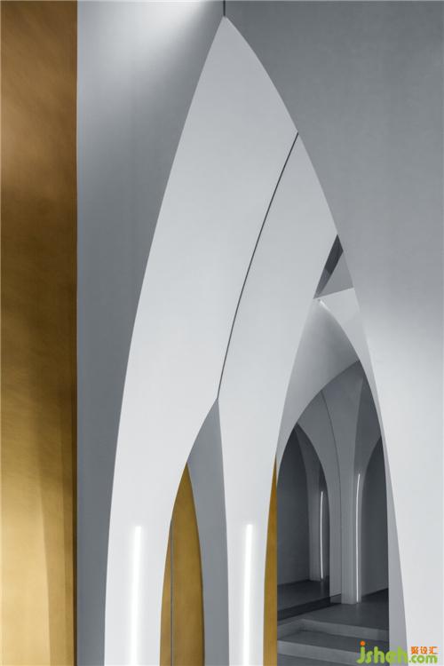 △ 常規(guī)宗教建筑重視陣列,而設(shè)計(jì)師卻弱化了陣列的效果,保留宗教建筑穹頂?shù)慕ㄖO(shè)計(jì),現(xiàn)代結(jié)合古老結(jié)構(gòu)三曲面設(shè)計(jì),運(yùn)用3D打印工藝演變成具趣味性的長廊