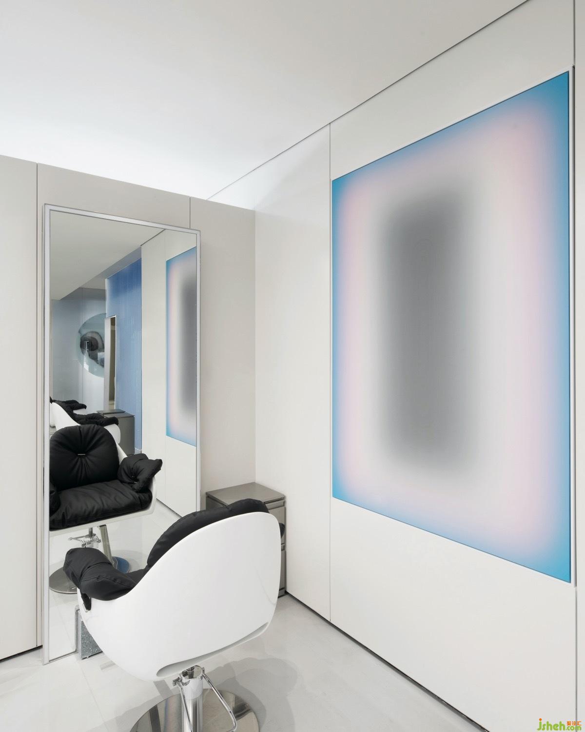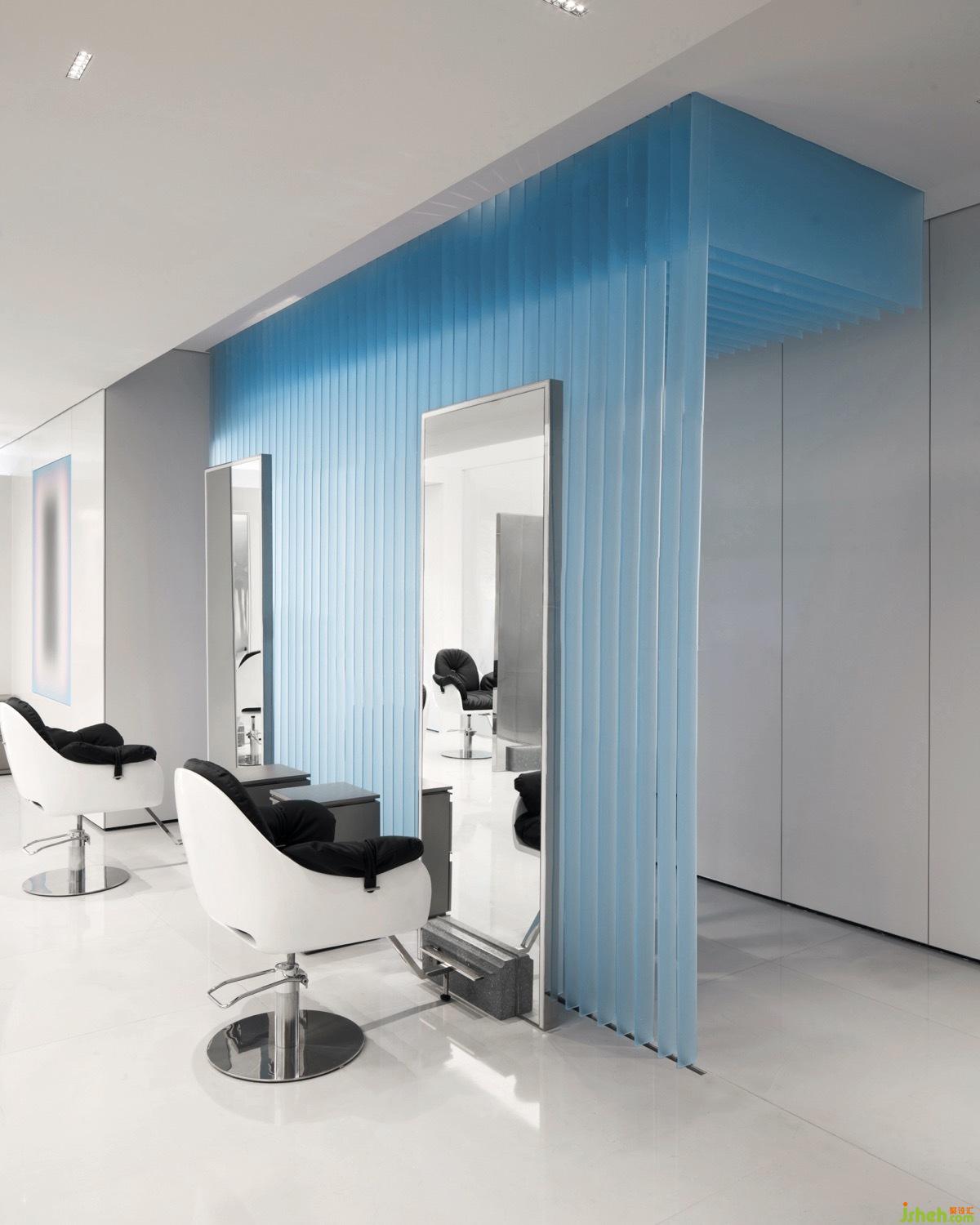美發(fā)沙龍設計空間中選用朦朧神秘感的藍色,以一種若隱若現(xiàn)的姿態(tài),彷如神秘維度里的一束的光。撥開迷霧觸摸光,空間被賦予層層遞進的生命探索感,步入空間前區(qū),不禁萌生好奇,充滿藝術(shù)氛圍的空間究竟承載著怎樣的故事與用途?