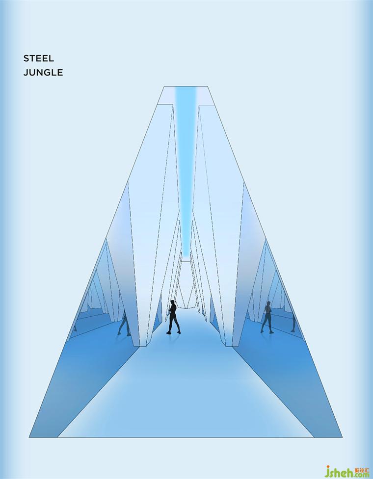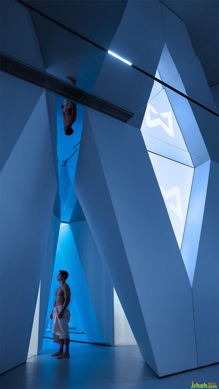 設(shè)計師利用更衣室締結(jié)生活的真實感受,旗艦店設(shè)計在未知和已知中不斷轉(zhuǎn)變,每一個出口都將開啟新的入口,長廊兩側(cè)設(shè)置更衣室,遵循高品質(zhì)的用戶體驗,利用簡潔的幾何體塊引導(dǎo)視線和動線的發(fā)展,給予私密的環(huán)境來平和內(nèi)心的感受。