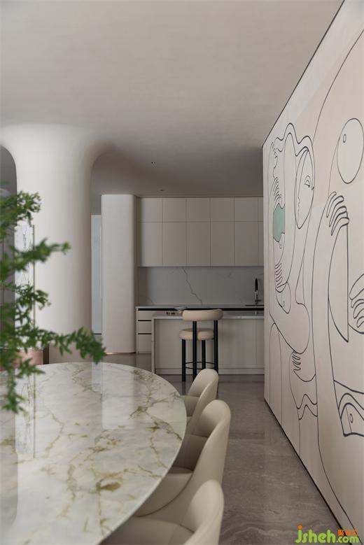 場景的多元化增添生活的儀式感,開放式的起居式廚房促進家庭的接觸和交流。成都蔚藍卡地亞湖畔別墅設計餐廳延續(xù)使用藝術化的語言闡述,怪誕且富有表現(xiàn)力的墻面,形成有一種野蠻生長的自然感。