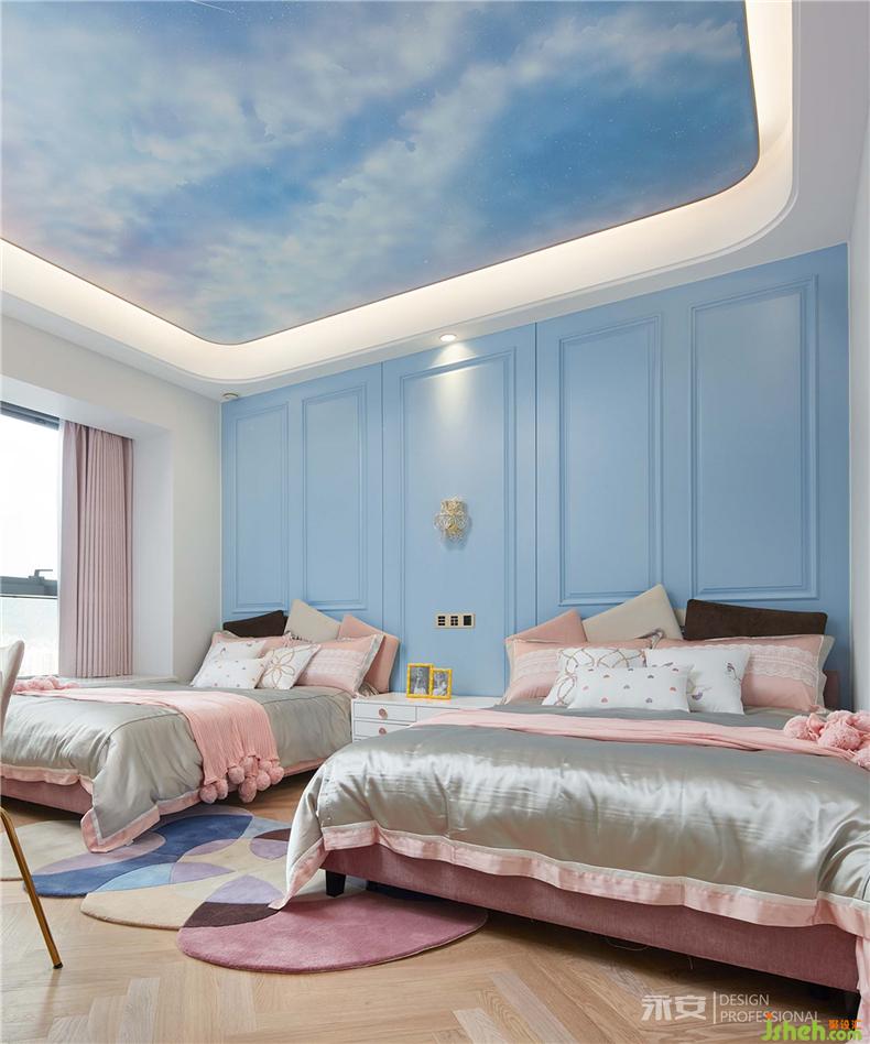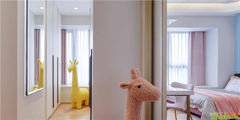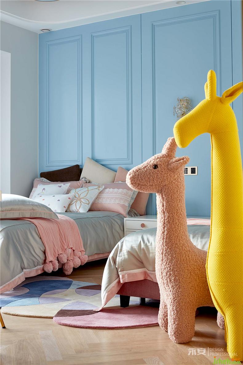 房?jī)?nèi)的軟裝陳設(shè)也是設(shè)計(jì)者對(duì)童心的細(xì)微呵護(hù),兩只萌萌的長(zhǎng)頸鹿是公主們天馬行空般童話(huà)世界里的玩伴,童趣的床尾墊在呼應(yīng)房間主題的同時(shí),也起到了應(yīng)有的保護(hù)作用