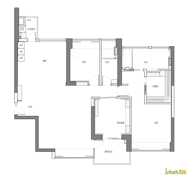 主體是深色木紋頂天立地大衣柜的衣帽間,以簡潔實用的設(shè)計目的立意,不失都市生活的摩登氣質(zhì)室內(nèi)設(shè)計師