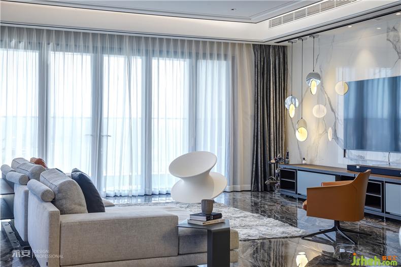 從米色的沙發(fā)到深咖色的電視柜、從煙波紋的地板到蟬翼般的紗簾,材質(zhì)與色彩的剛?cè)岵?jì),體現(xiàn)出個(gè)性與共性交織下的包容感