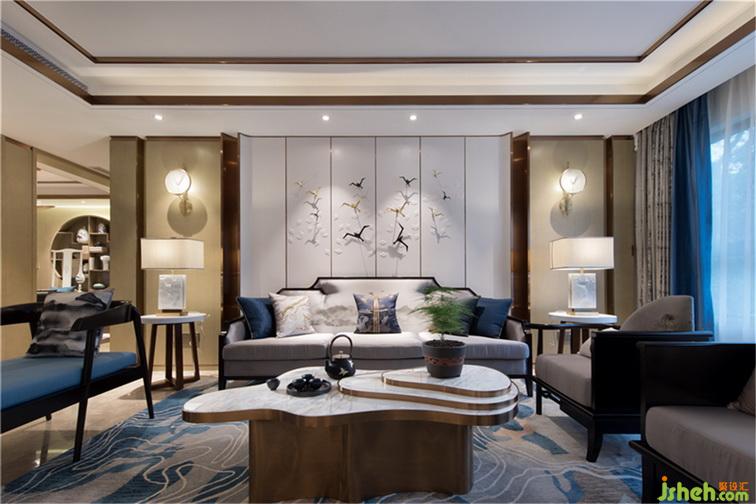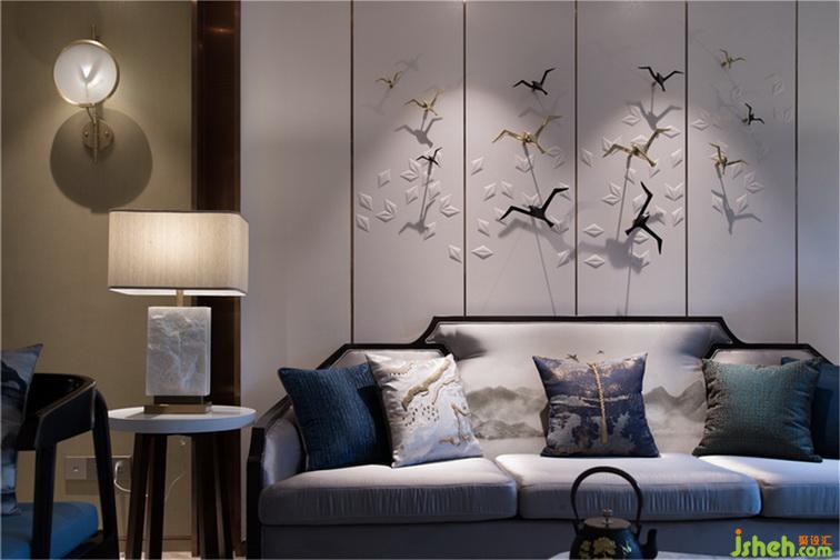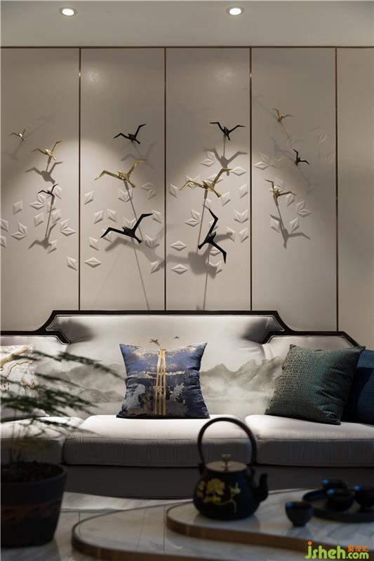 沙發(fā)、背景墻運(yùn)用山水圖案,作為整個(gè)空間的色彩及主題點(diǎn)綴。